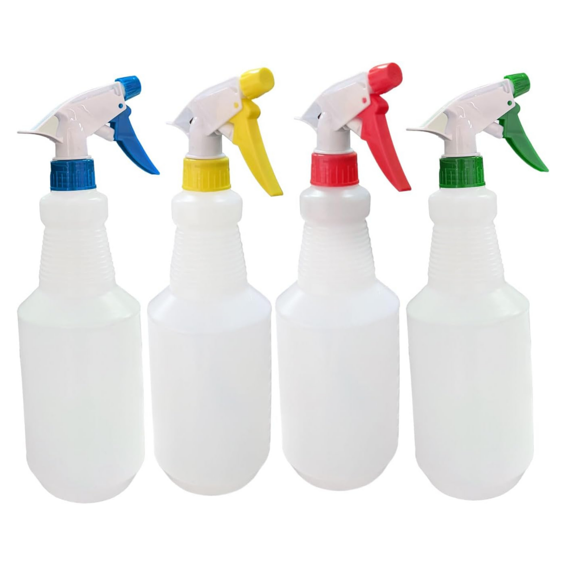 Make cleaning easier with this Lavex plastic bottle with assorted color spray triggers. This kit includes 3 red triggers, 3 yellow triggers, 3 blue triggers, 3 green triggers, and (12) 32 oz. plastic bottles. Made of durable and leak-resistant plastic, each bottle is perfect for storing and dispensing various cleaning solutions. The bottle's translucent polyethylene design allows for optimal visibility, making it easy to identify the contents and monitor the remaining amount. With molded-in graduations, you can accurately measure and mix your chemicals for precise cleaning applications. The unlabeled design gives you the flexibility to use it for different cleaning solutions without the need to constantly relabel. The shape of its neck is designed for easy pouring, ensuring a smooth transfer of liquids without spills or mess